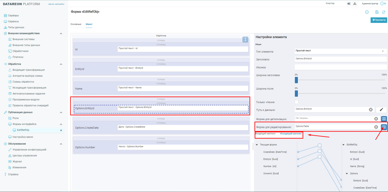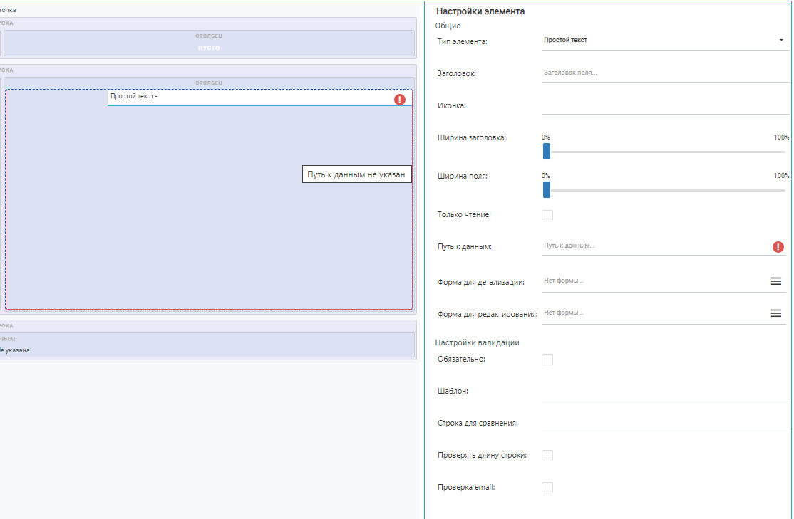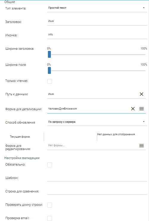 Переменная - Панель для создания переменных, где можно указать их имя и тип данных. Переменные используются при настройке вложенных форм. Если необходимо вывести переменную, то при настройке поля отображения в пути к данным укажите ее имя через @, например @Переменная1.
