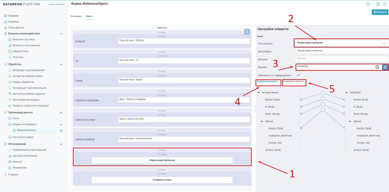 Ожидать данные - период ожидания выгрузки данных в мс. Допустимые значения этого параметра от 0мс до 600000мс. Если указано ожидание 0мс, то в качестве периода ожидания берется значение параметра timeout из конфигурации модуля UI, с которого идет запрос к форме редактирования.