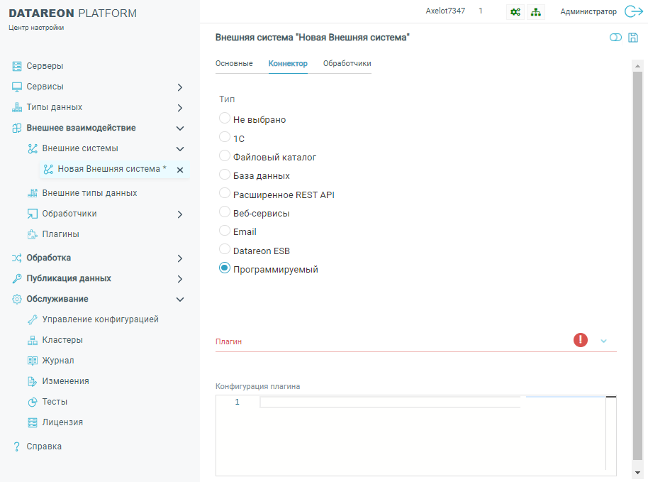 2. Нажмите на кнопку +. В рабочей области страницы отобразится интерфейс создания / редактирования новой внешней системы, содержащий три вкладки: Основная, Коннекторы и Обработчики: