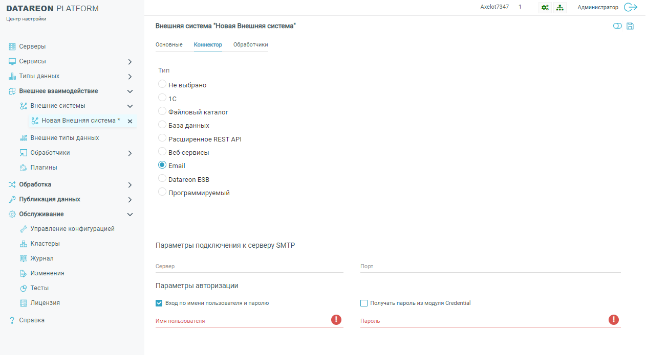 2. Нажмите на кнопку +. В рабочей области страницы отобразится интерфейс создания / редактирования новой внешней системы, содержащий три вкладки: Основная, Коннекторы и Обработчики: