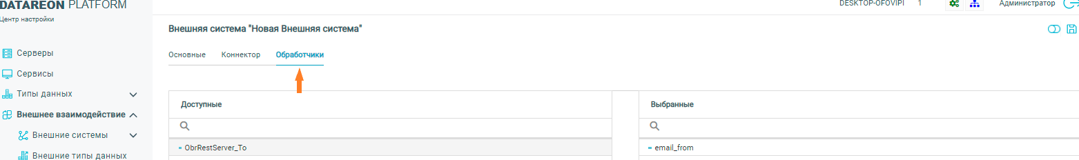 Если будут выбраны обработчики с недопустимым типом, то при попытке сохранить конфигурацию будет выдано предупреждение об ошибке: Внимание! Не удалось сохранить: есть ошибки валидации! После добавления обработчика и сохранения системы, указанная система появится у выбранного обработчика на вкладке системы.