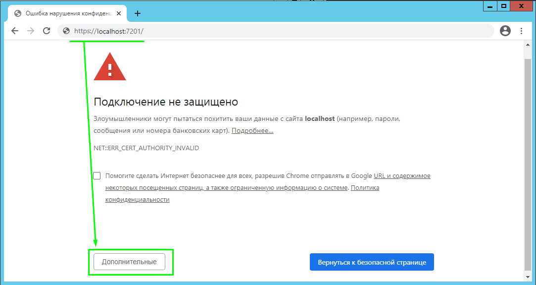 Если вы используете недоверенный SSL-сертификат, при первом подключении в браузере нажмите на кнопку Открыть дополнительные сведения перейдите по ссылке Перейти на <ip-адрес>.