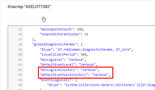 Детализация логируемых данных определяется согласно настроенному уровню логирования minLogLevelHistory и defaultEventLevelHistory в конфигурации кластера: