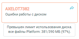 При достижении порога в 90% - появляется плитка со статусом Предупреждение о нехватке места.