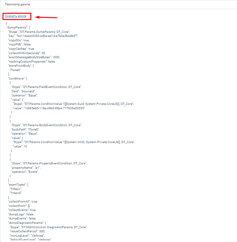 Дамп доступен к просмотру на вкладке Собранные дампы. В окне просмотра дампа есть опция, позволяющая скачать архив со всей информацией:
