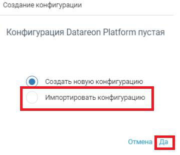 Если ранее Платформа не была установлена, то при входе в ЦН будет отображаться окно Создание конфигурации. Для импорта конфигурации выберите вариант Импортировать конфигурацию и нажмите на кнопку Да.