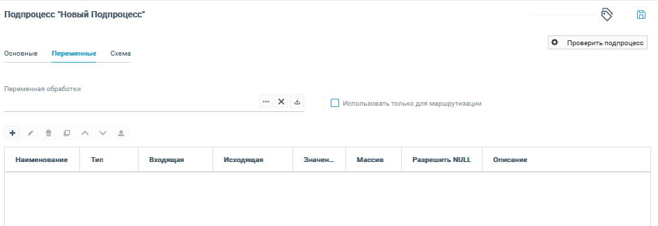 Раздел предназначен для создания сложных и простых переменных для выполнения подпроцесса. Типы переменных обработки: