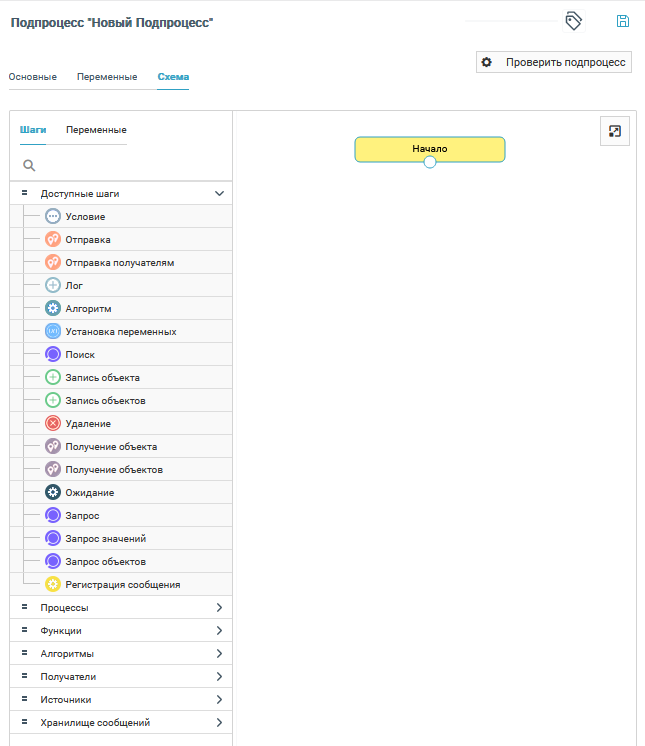 Кнопка Проверить подпроцесс предназначена для запуска механизма проверки конфигурации открытого подпроцесса.