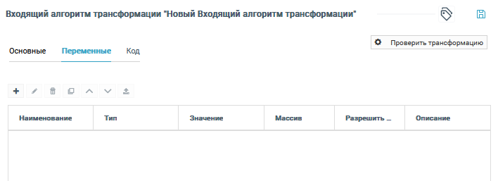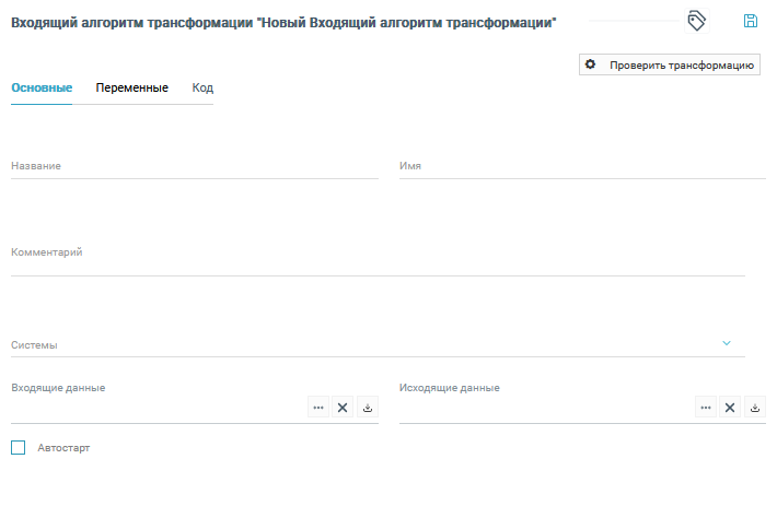 Окно входящего алгоритма трансформации содержит следующие элементы: