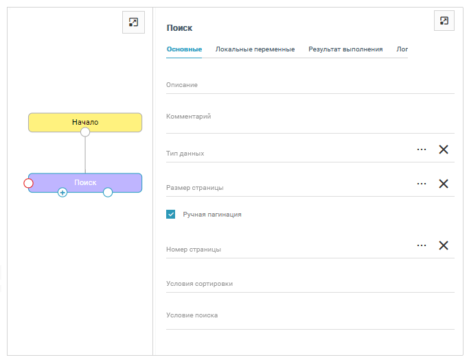 Флажок Ручная пагинация включает опцию постраничного поиска (по умолчанию не установлен). При установке флажка будет отображено поле Номер страницы для указания номера страницы, на которой будет происходить поиск. Например, если всего записей в банке 10, размер страницы = 5 и номер страницы = 0, то поиск будет запущен только по первым 5 записям. Если размер страницы = 15, номер страницы = 1, то поиск гарантировано не даст результата, так как поиск будет запущен на 16-30 записи. Также доступен выбор значения переменной из выпадающего меню при нажатии на кнопку ....