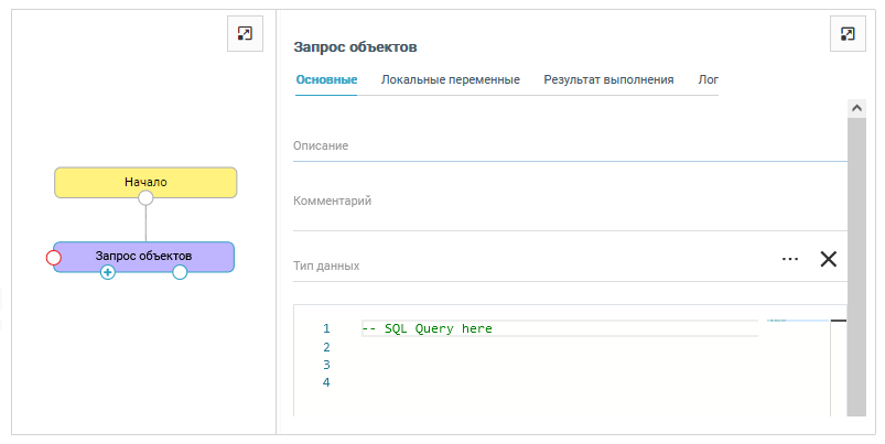 Для настройки шага нужно указать тип данных, являющийся объектом банка данных, и ввести SQL-запрос в поле. Результатом успешного выполнения запроса является ответ банка. Ответ находится в переменных Результаты и Количество на вкладке Результат выполнения. Результат выполнения запроса можно получить путем выполнения маппинга переменной Результаты в переменную процесса.