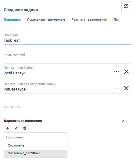 В разделе Варианты выполнения отображаются зарегистрированные состояния задачи с возможностью их редактирования (добавлять или удалять состояния).