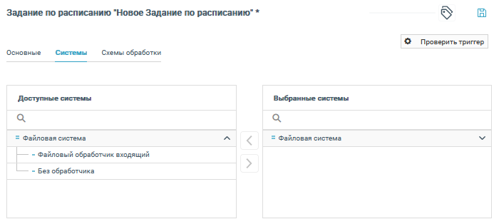 Для запуска обработчика по расписанию на системе нужно добавить его в Выбранные системы, выбрав нужную системы и нажав на стрелку >.