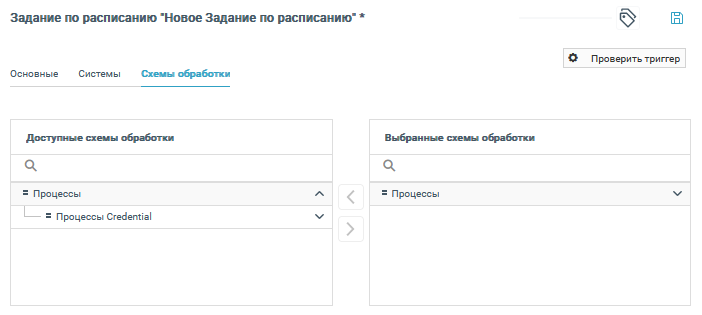 Необходимо указать какие схемы обработки будут запускаться. Запуск задания фиксируется в центре мониторинга в журнале системы, для которой назначено задание.