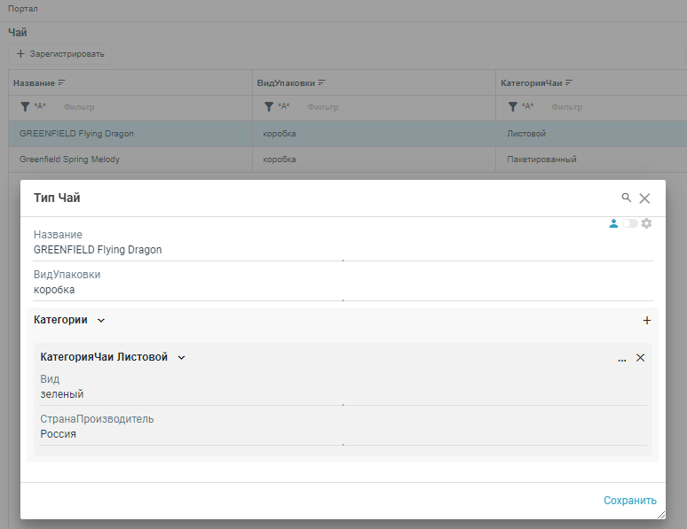 Создан тип данных Чай с полями Название и ВидУпаковки, для типа добавлена категория КатегорияЧаи.