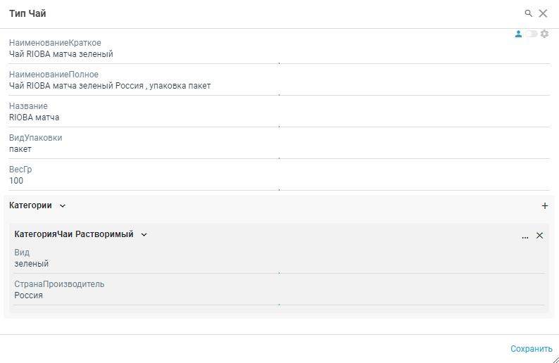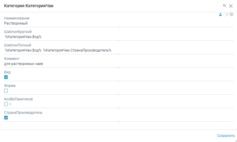 В результате при записи экземпляра типа Чай значения полей НаименованиеКраткое и НаименованиеПолное заполнятся автоматически с использованием значения из полей типа и атрибутов выбранной категории.