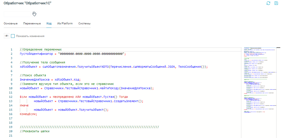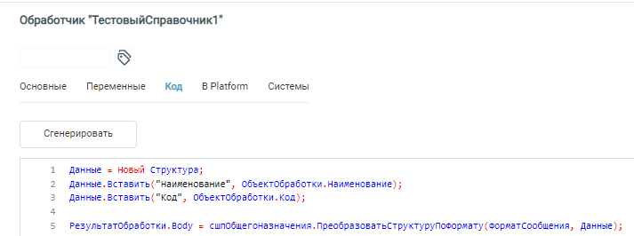 Содержит данные, которые будут передаваться из Платформы при соответствующем направлении интеграции, выбранном на вкладке Основные. На вкладках В Platform и Из Platform определяется - с каким типом данных будут обрабатываться сообщения данным обработчиком. Если из Платформы пришло сообщение с типом, указанным на данной вкладке, то этот обработчик будет выбран для этого сообщения, затем выполняется код обработчика (при наличии).