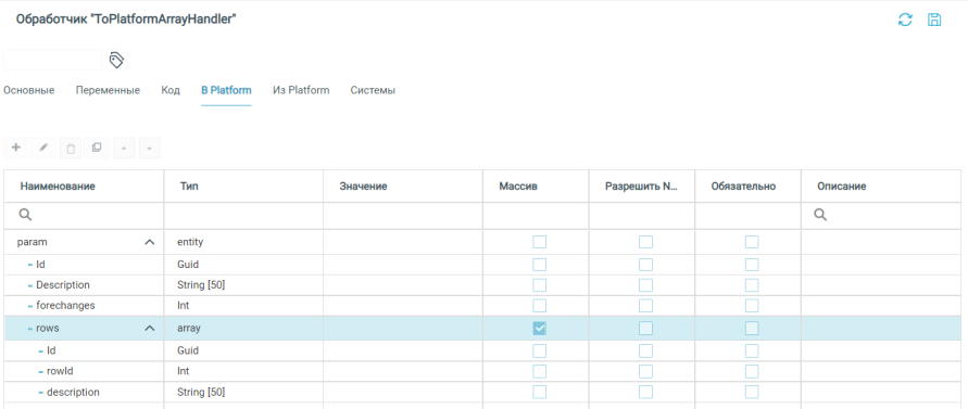 Здесь можно создать локальные переменные обработчика. К локальным переменным с одной стороны есть доступ из бизнес-процессов при отправке объектов во внешнюю систему; локальные переменные также доступны для использования в SQL-коде обработчика на вкладке Код. Вызов переменной в SQL коде: @Идентификатор.