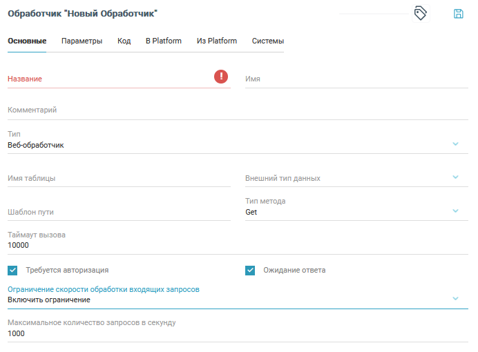 Нажмите на кнопку +. В рабочей области страницы отобразится интерфейс создания нового обработчика.