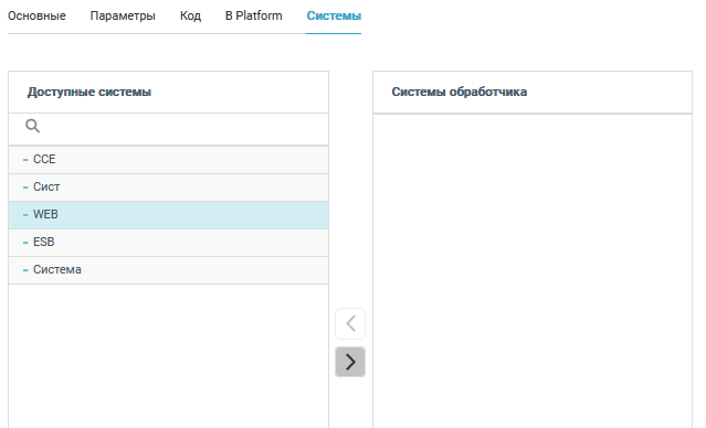 Для выполнения обработчика на системе необходимо присвоить обработчик системе. Для этого на вкладке Системы добавьте в список Системы обработчика обработчик из списка Доступные системы путем выбора строчки и нажатием на кнопку >. Обработчик может выполнятся на нескольких системах: