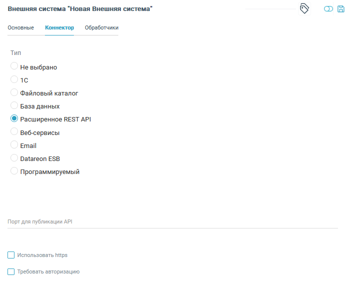 Чтобы приступить к настройке внешней системы, на вкладке Коннектор выберите тип Расширенное REST API. После выбора типа коннектора станут доступны поля для ввода характеристик внешней системы: