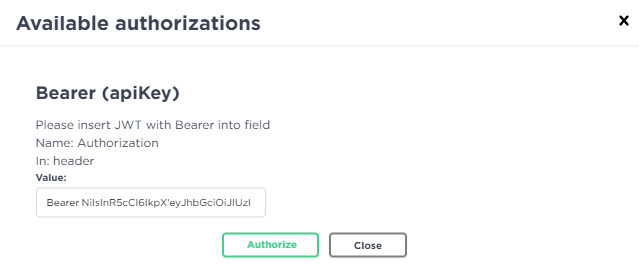 Для авторизации в Swagger системы получите актуальный токен с помощью POST запроса /api/session/token, введите значение Bearer и через пробел значение полученного токена в окне Available authorizations и нажмите на кнопку Authorize.