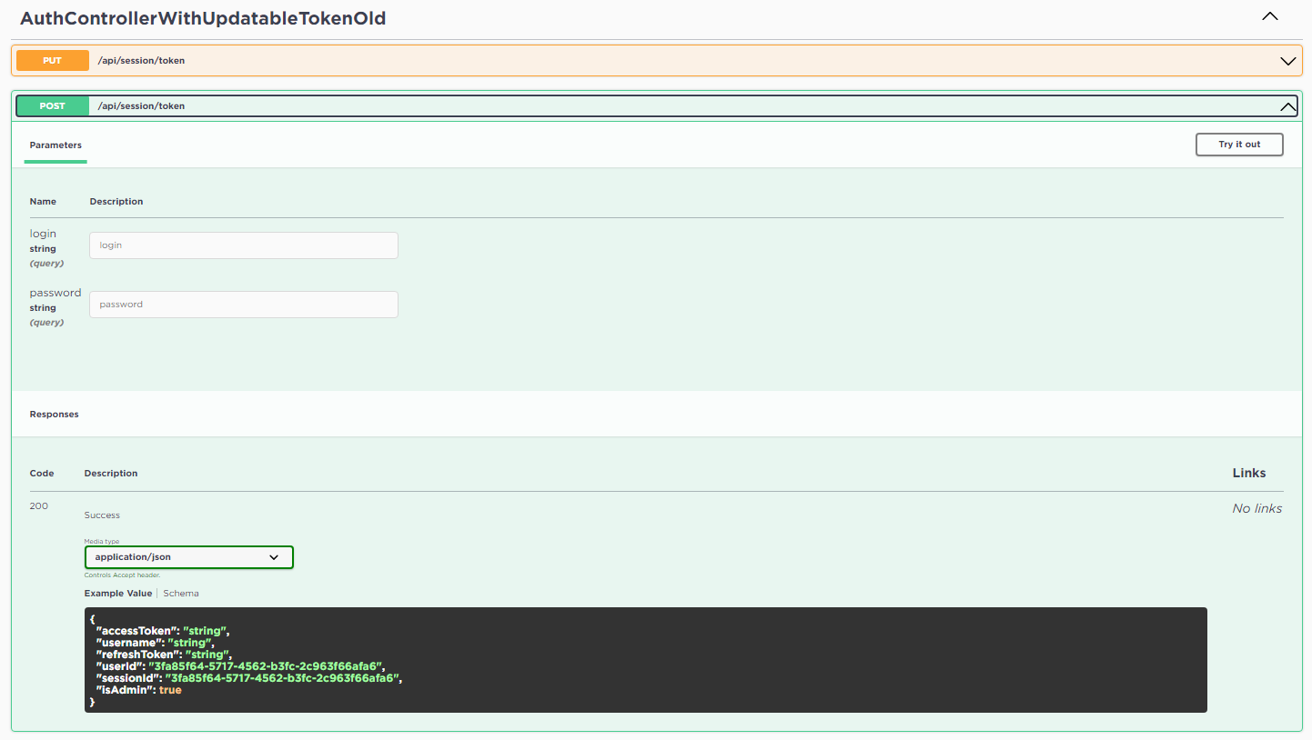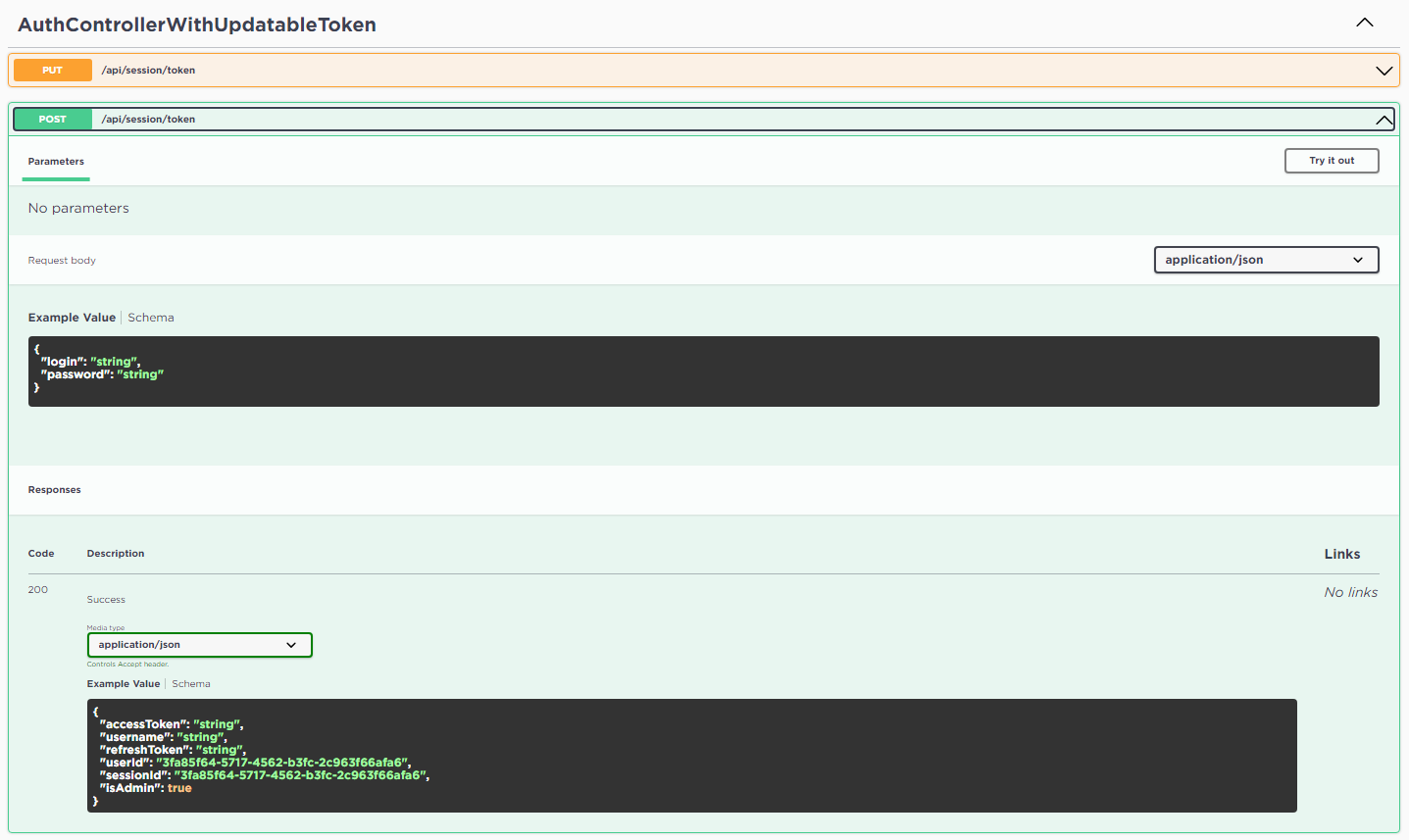 Если в настройках сервиса Управление пользователями в значении поля tokenIsUpdatable указано значение true, поле RefreshToken json-ответа на POST запрос /api/session/token хранит значение токена (поле RefreshToken) для обновления токена авторизации AccessToken (если tokenIsUpdatable = false, в RefreshToken возвращается null), при обновлении токена авторизации сохраняется сессия (SessionId). Также к API-запросам работы с внешней системой добавляется PUT запрос /api/session/token, с помощью которого можно обновить AccessToken.