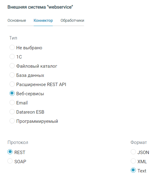 Чтобы приступить к настройке внешней системы, на вкладке Коннектор выберите тип Веб-сервисы. После выбора типа коннектора станут доступны поля для ввода характеристик внешней системы: