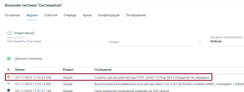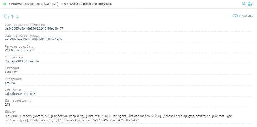 copyPropertiesToResponse (boolean): значение параметра по умолчанию false. При true и при выполнении шага Отправка с установленным значением Ожидать ответа в поле Ожидание Платформа копирует все свойства из отправляемого во внешнюю систему сообщения (это сообщение формируется из того, что указано в поле Сообщение шага Отправка схем обработок) в переменную ОтветноеСообщение (вкладка Результат выполнения шага Отправка). Свойства отправляемого сообщения фиксируются в событии IntSend в ЦМ на вкладке События внешней системы.