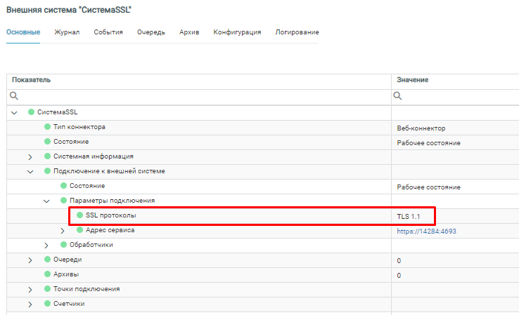Поддерживается работа со следующими протоколами: TLS1.0, TLS1.1, TLS1.2. Доступны к использованию только протоколы, указанные в параметрах TLS при запросах к системе. Настройка протокола учитывается только при значении true параметра useHttps. Актуальные настройки SSL отображаются в ЦМ: