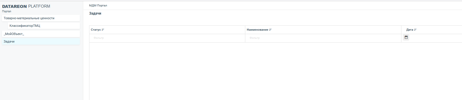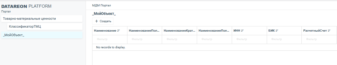 При переходе в данный раздел откроется страница с таблицей, содержащей информацию о созданных экземплярах типа мастер-данных, и кнопкой Создать: