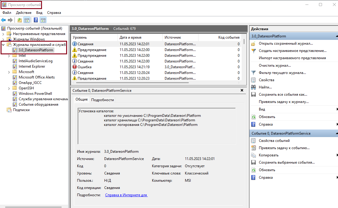 Ошибки установки регистрируются в системном журнале на Windows в приложении Просмотр событий во вкладке Журналы приложений и служб → 3.0_DatareonPlatform