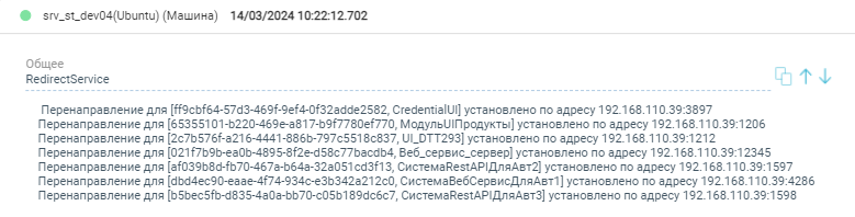 При запуске сервера или при применении конфигурации регистрируется событие с информацией о включенных перенаправлениях сервисов и внешних систем. Данное событие регистрируется в журнале на каждом сервере кластера.