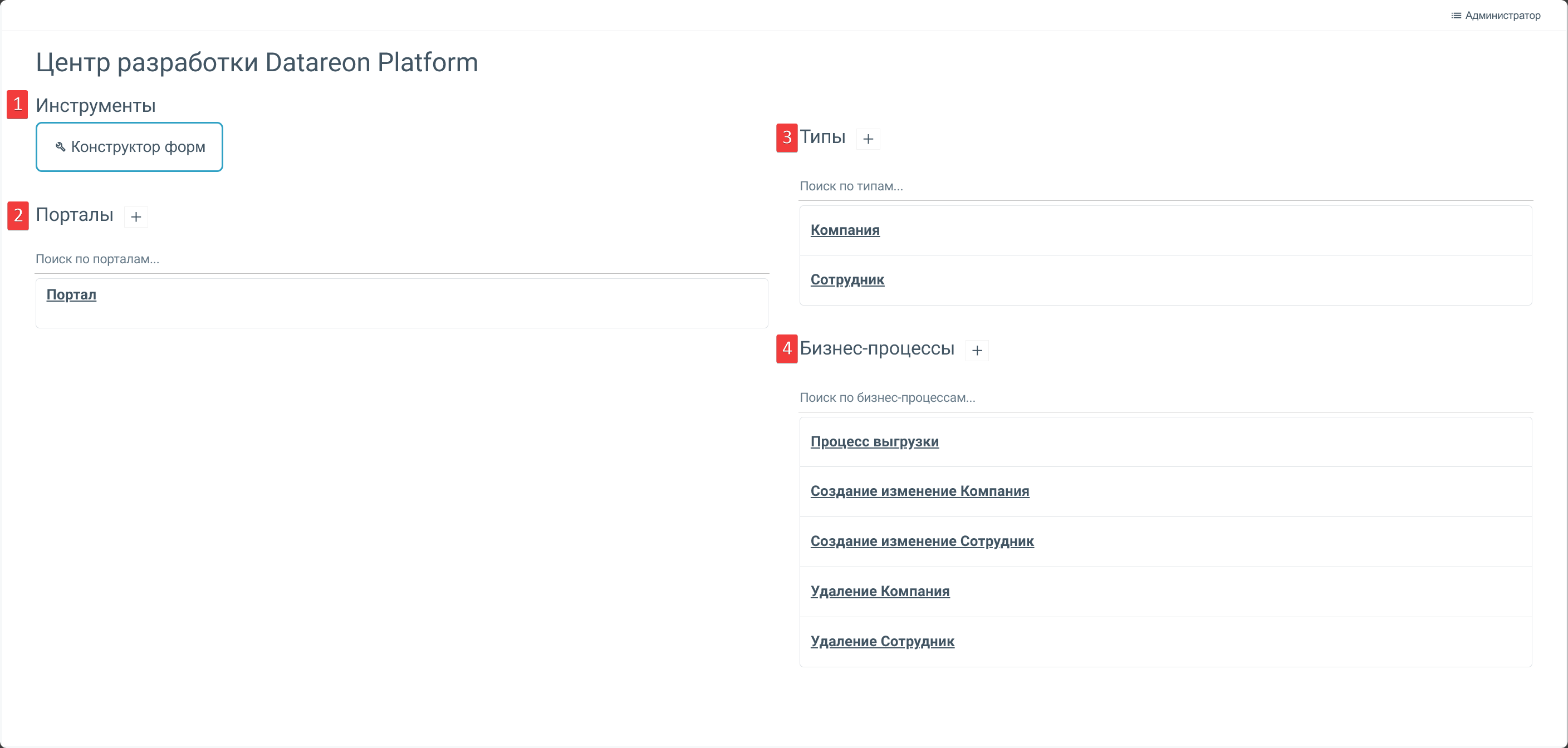 Типы: позволяет осуществить поиск по типам данных, создать или перейти к редактированию типа данных в Центре настройки. При нажатии на кнопку + осуществляется переход в ЦН для создания типа данных.