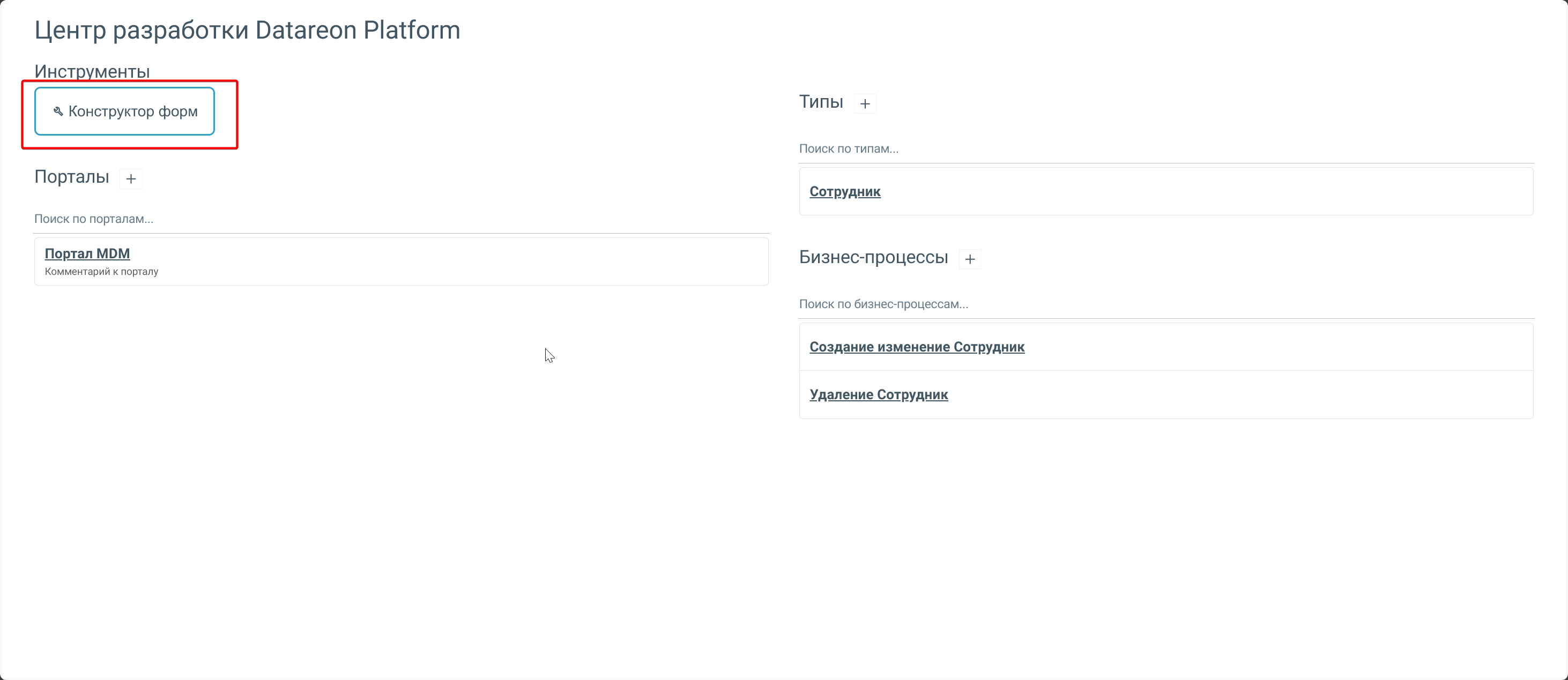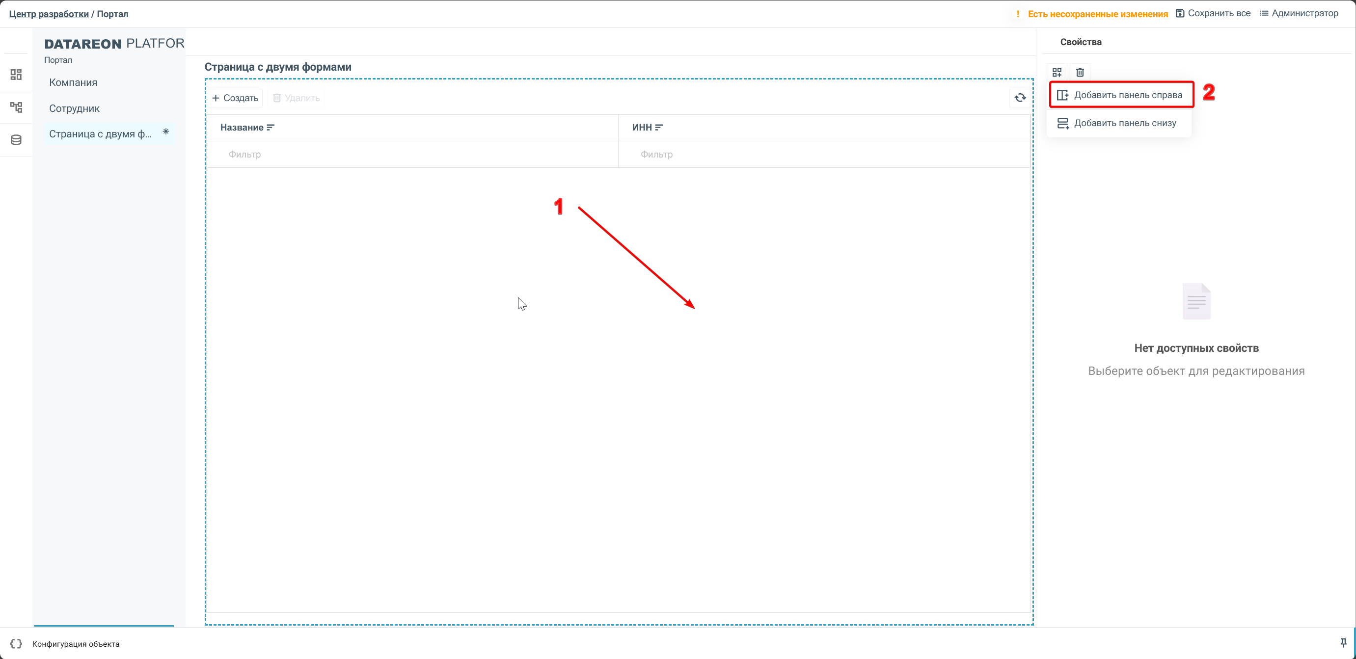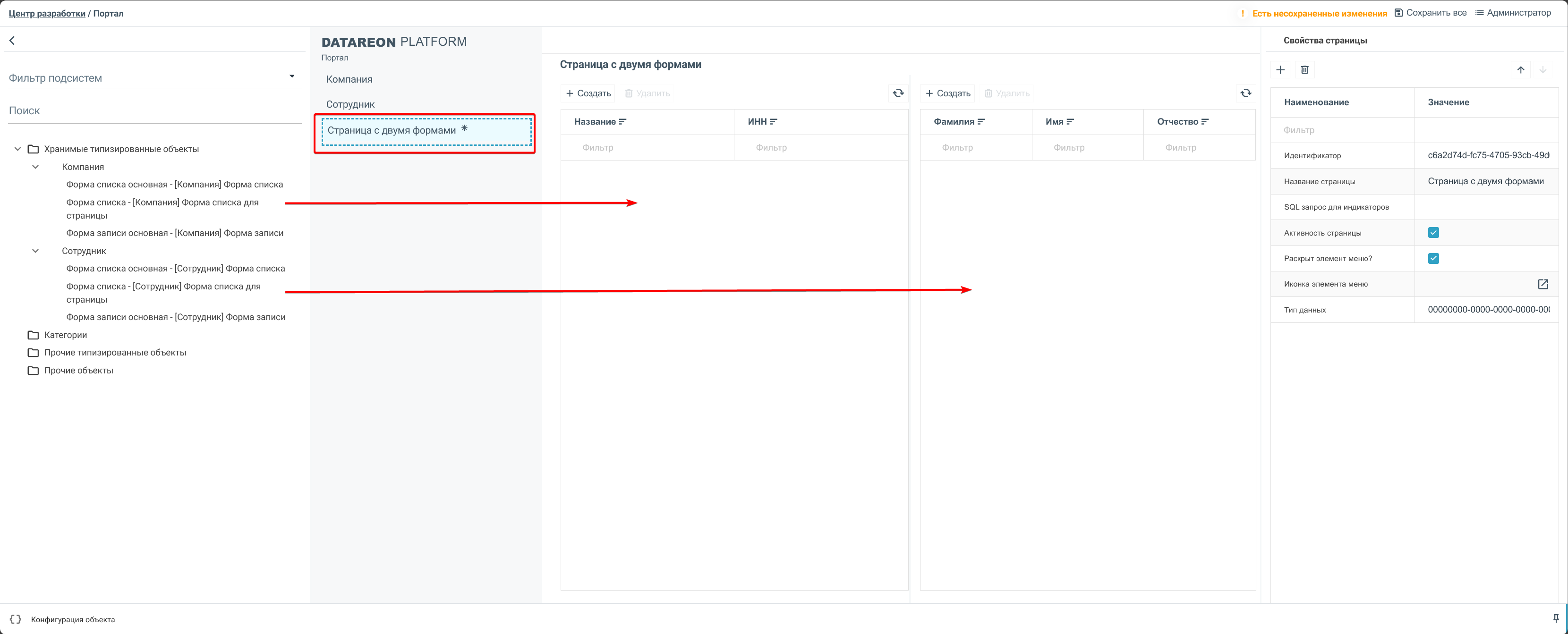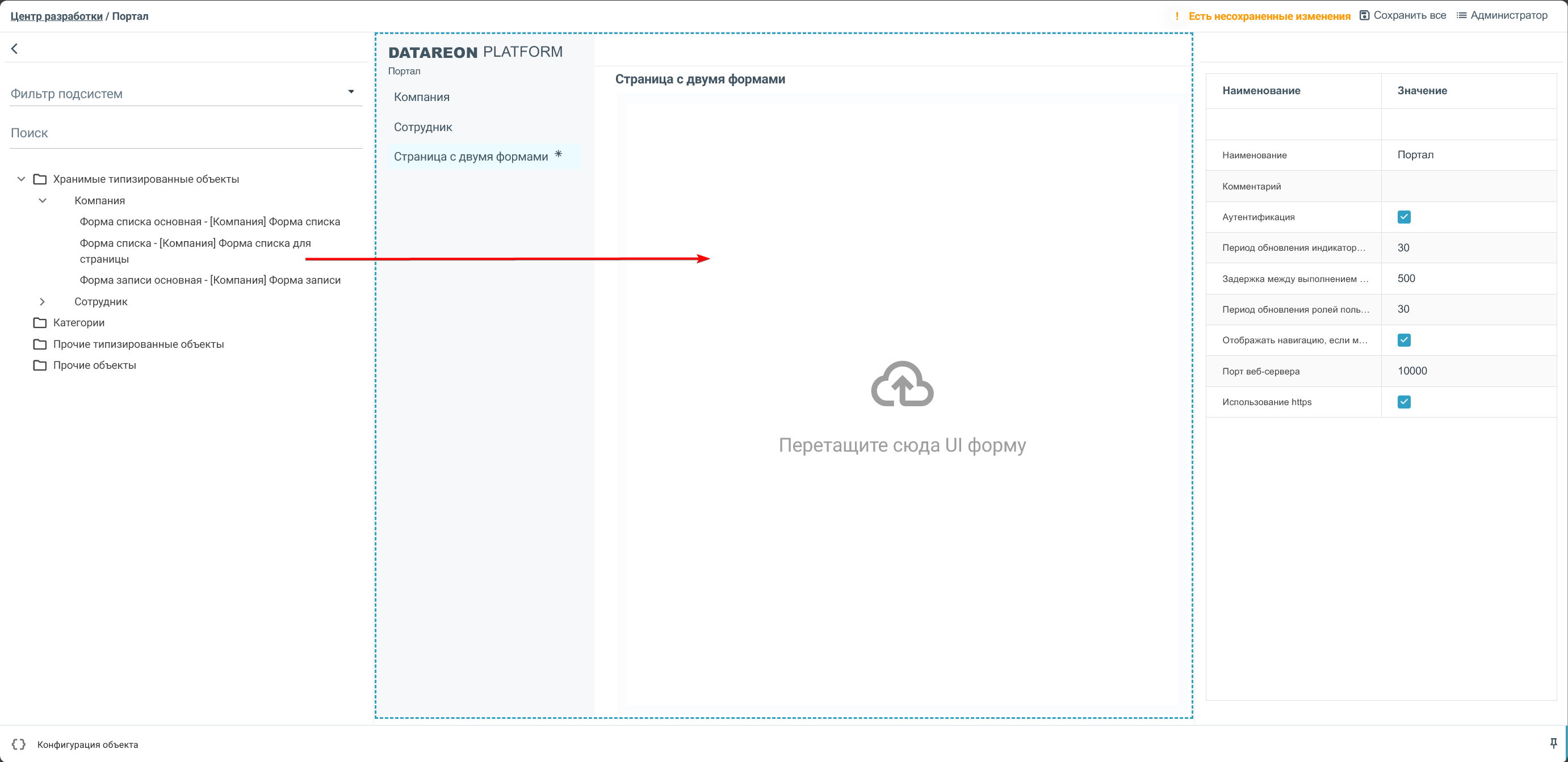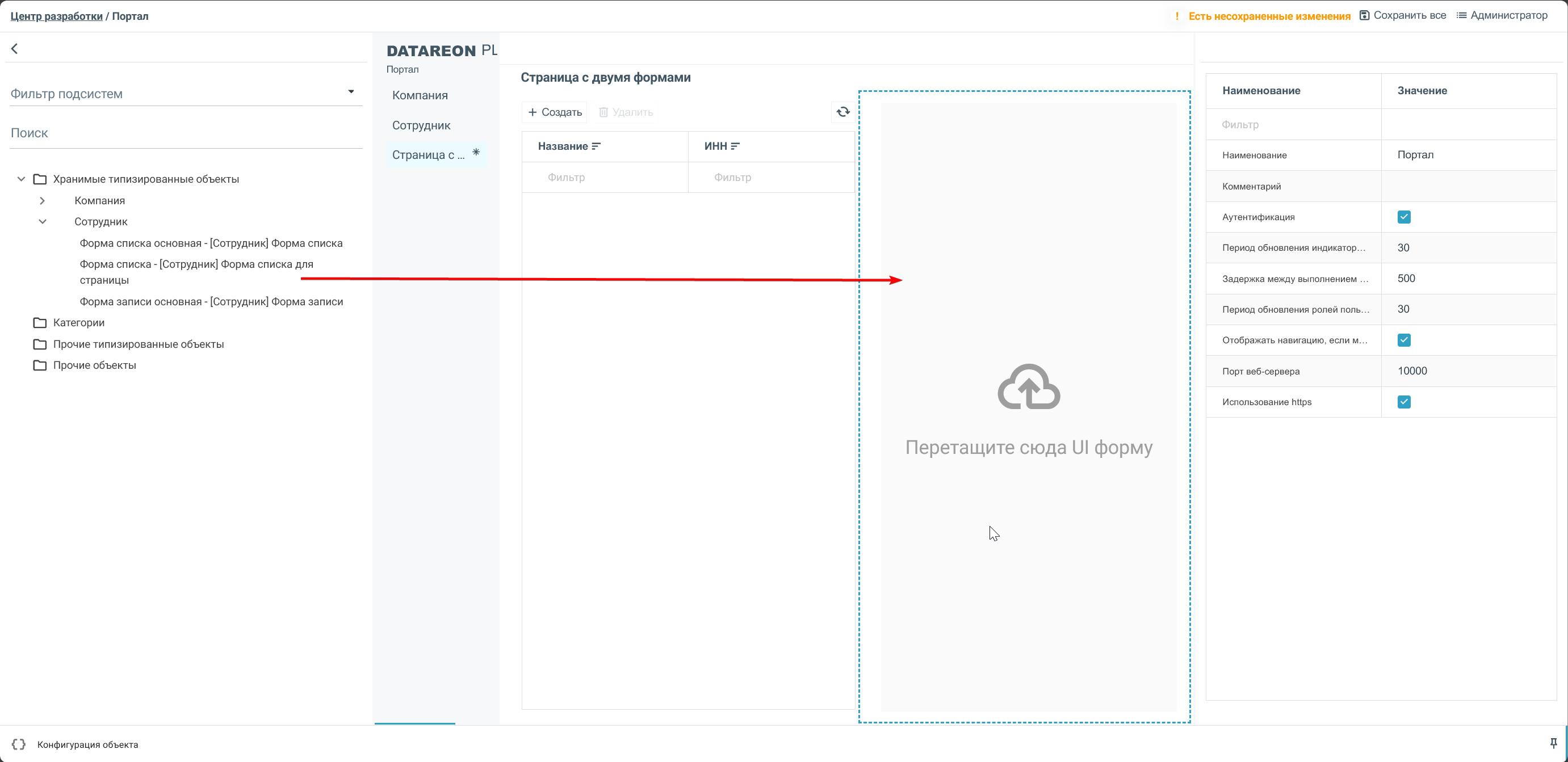 Перетащите первую форму на страницу из панели объектов в конструкторе портала