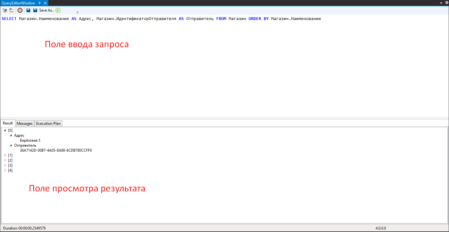 Верхнюю половину окна занимает Поле ввода запроса, нижнюю половину окна занимает Поле просмотра результата.