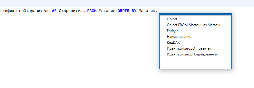 При вводе запроса расширение предлагает список автозаполнения, доступных к использованию, объектов и их полей из конфигурации Platform и, используемых в языке запросов, ключевых слов.