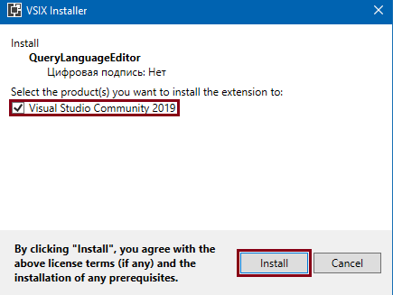 Для установки расширения нужно в распакованной папке запустить файл QueryLanguageEditor.vsix.