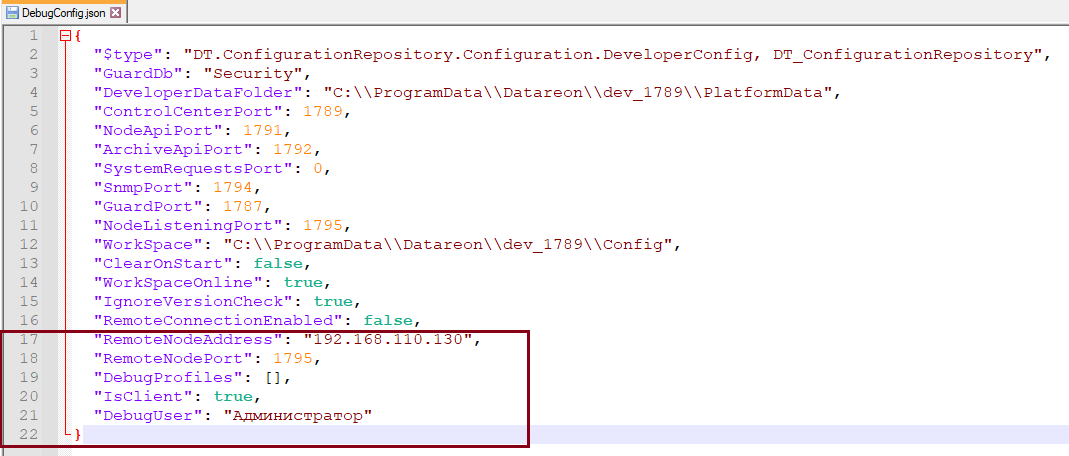 "RemoteConnectionEnabled": true, "DebugProfiles": [ { "UserName": "User1", "DebugKey":"383b2a55-41d1-4e4b-a025-79bfca87323b", "DebugScheme": "Scheme1", "UnprocQueueId": "483b2a55-41d1-4e4b-a025-79bfca87323b" } ]