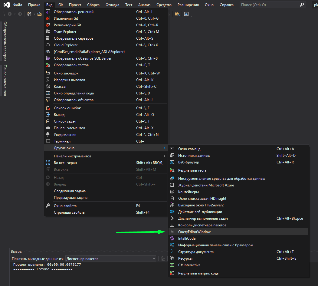 Запустите Visual Studio 2019. Окно работы с расширением находится в панели Вид > Другие окна>QueryEditorWindow.