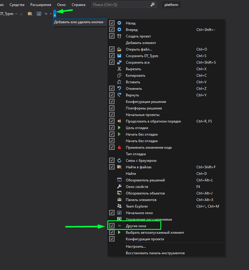 Выберите Добавить или удалить кнопки и поставьте галочку рядом с пунктом Другие окна.
