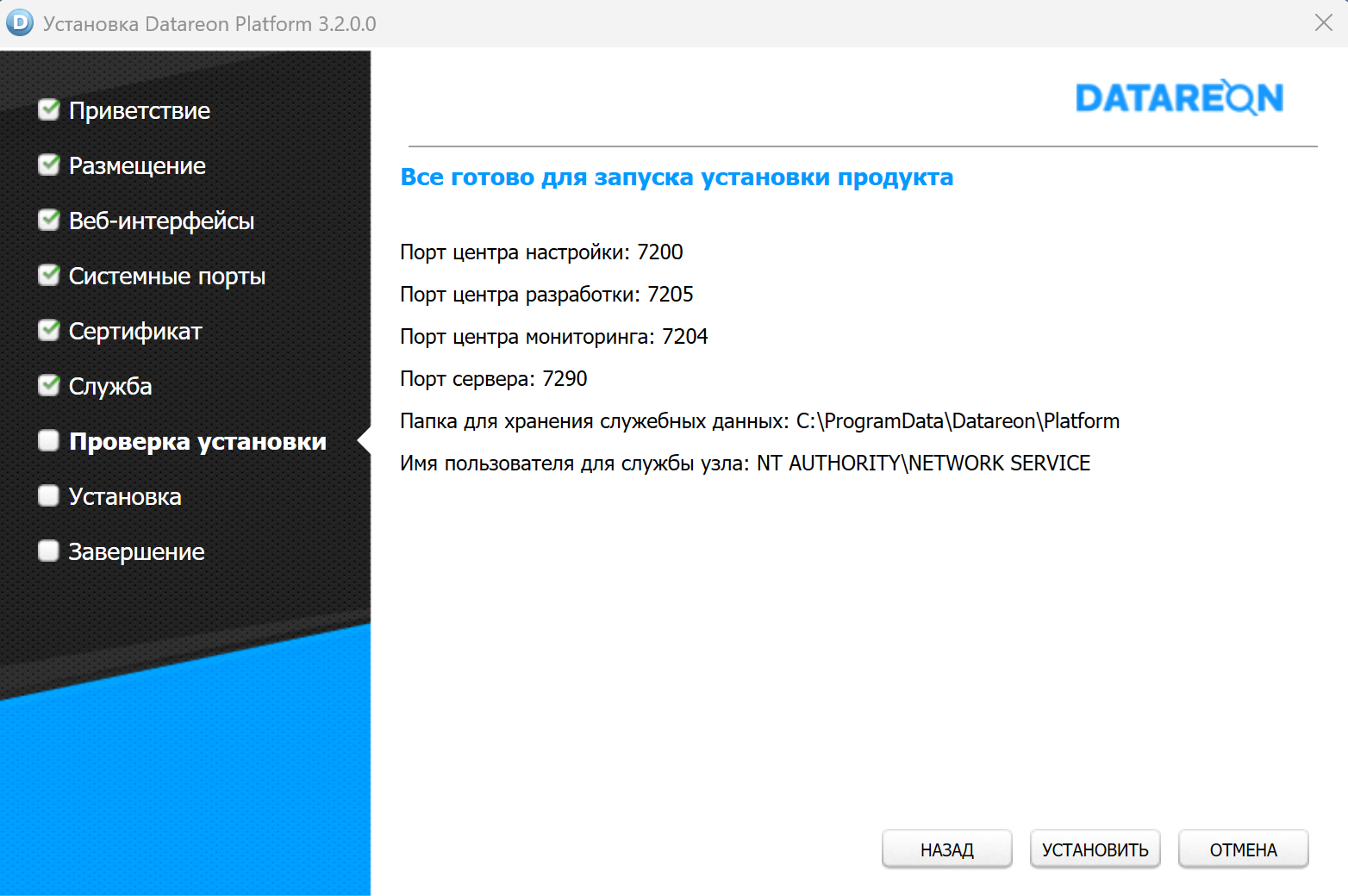 В окне Проверка установки проверьте параметры установки.