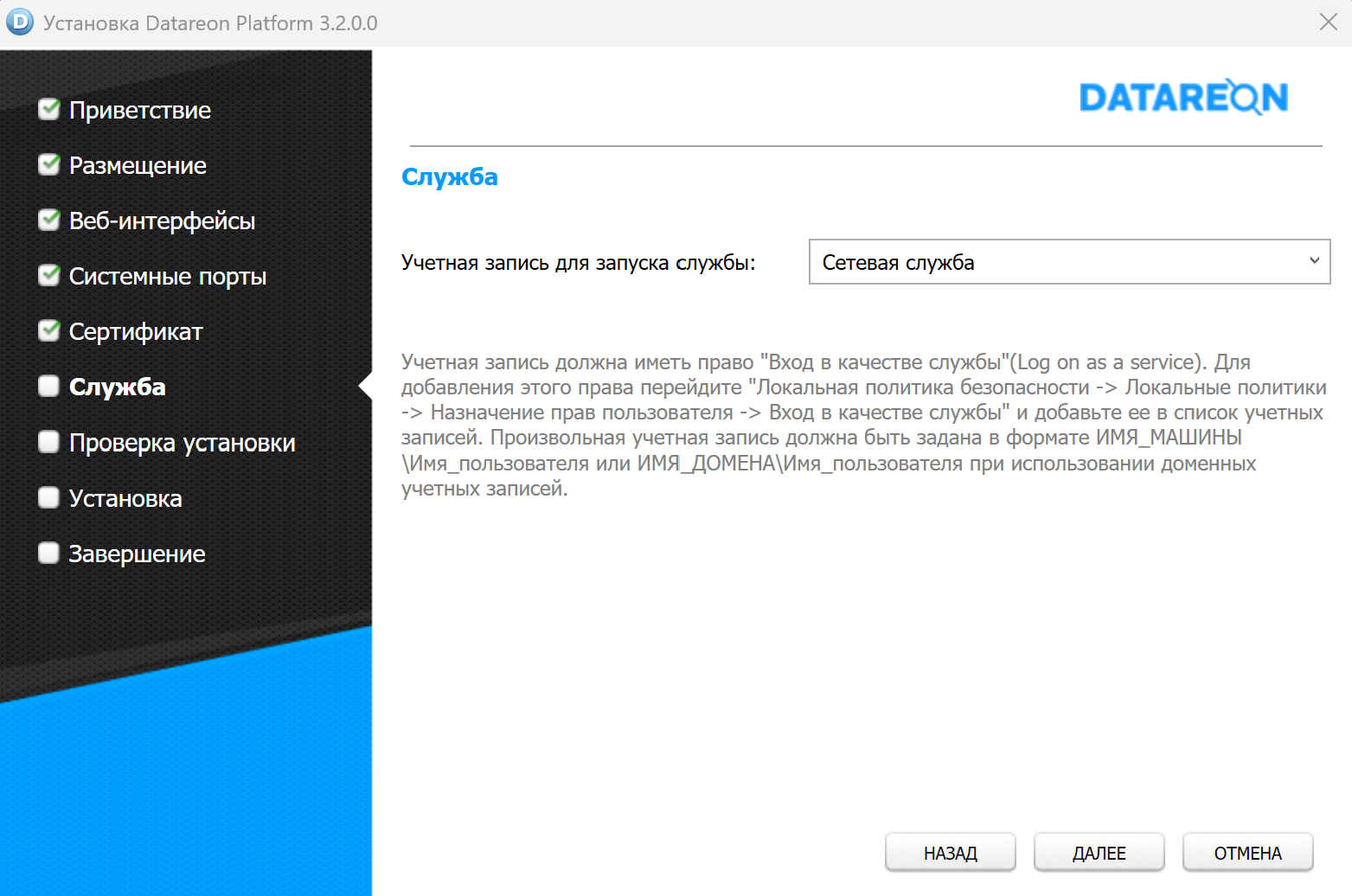 Нажмите на кнопку Далее для перехода к следующему окну мастера установки. Откроется окно Служба мастера установки:
