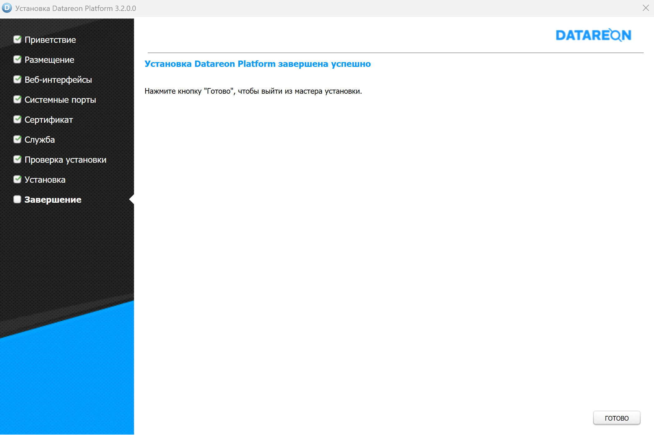 Нажмите на кнопку Готово для завершения работы мастера установки.