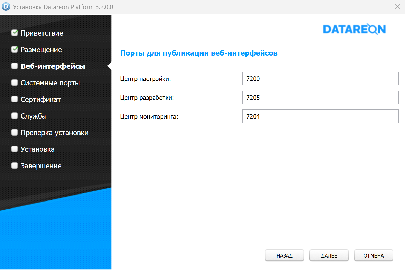 В поле Центр настройки введите номер порта, по которому будет опубликован web-клиент для настройки Платформы.