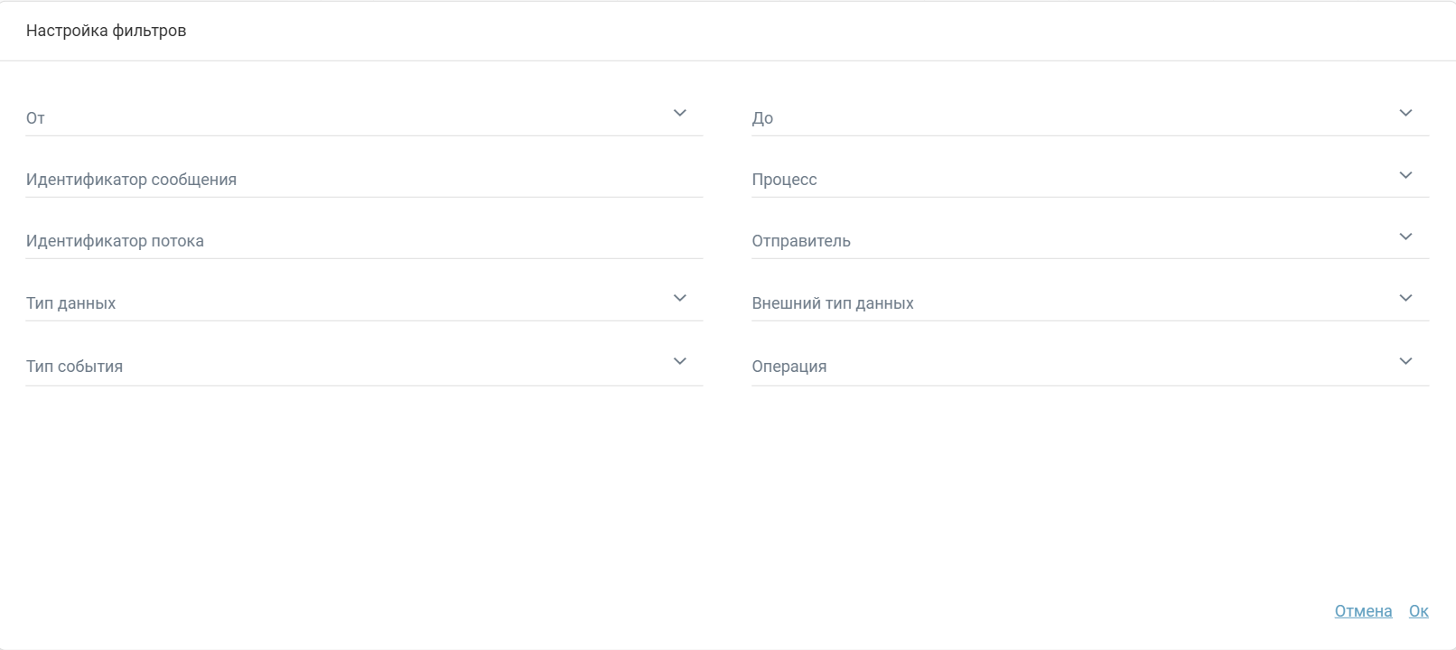 Можно задать интервал выборки, Идентификатор сообщения, Идентификатор потока или задать условия выборки в выпадающих списках: Отправитель, Тип данных, Внешний тип данных, Тип события, Процесс и Операция.