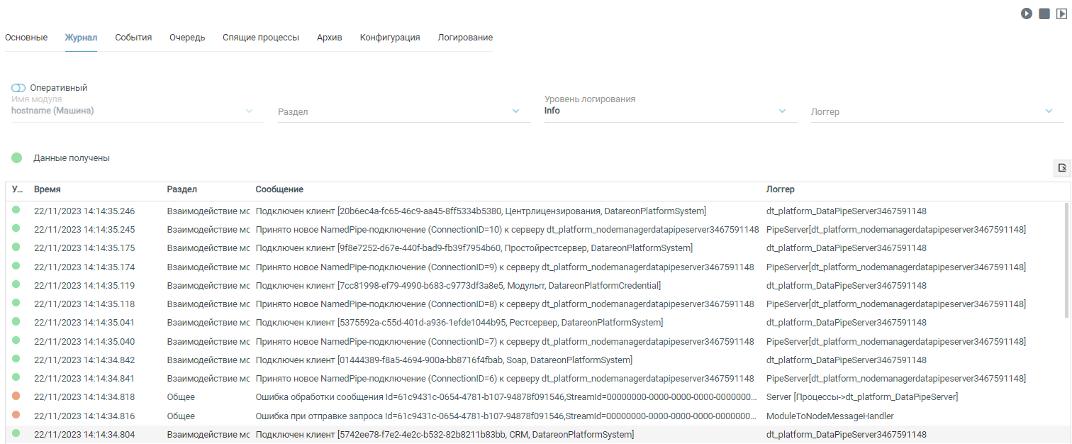 На вкладке с режимом Оперативный присутствуют фильтры в виде выпадающих меню: Раздел, Уровень логирования и Логгер. Эти фильтры позволяют настроить требуемую выборку.