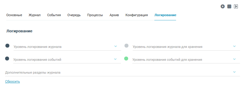 На вкладке Логирование есть возможность настроить в локальной конфигурации выбранного объекта уровень логирования для журналов и событий. Выбор уровня логирования осуществляется в соответствующих выпадающих меню. Для сброса значений логирования до установленных по умолчанию перейдите по ссылке Сбросить.