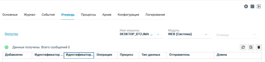 В Центре мониторинга просмотр данных очередей возможен непосредственно при работе сервера, сервиса или системы во вкладке Очередь выбранного объекта. Для очереди формируется snapshot и возвращается пользователю. Соответственно, на момент просмотра пользователем snapshot данные в очередях могут меняться.