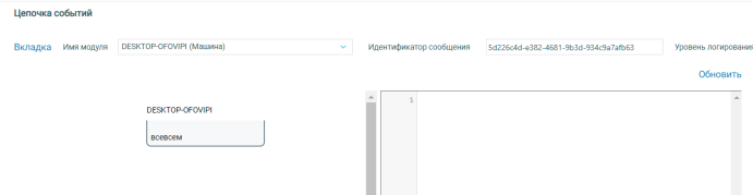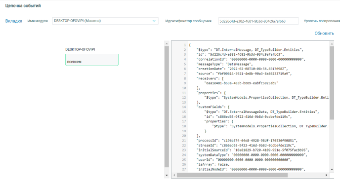 Для возврата нажмите на клавишу Escape или на стрелку возврата в браузере. Возврат происходит на вкладку Очередь. Кнопка Цепочка событий выводит графическую схему цепочки событий для данного идентификатора сообщения, справа находится кнопка Обновить для обновления данных: